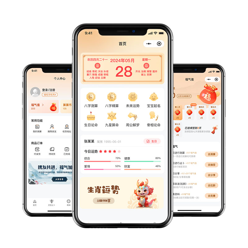 1.主要板块:八字测算/精算;手相/面相周公解梦;老黄历;每日运势等